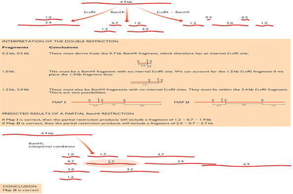 The results of single and double restrictions are shown at the top. The sizes of the fragments given after double restriction enable two alternative maps to be constructed, as explained in the central panel, the unresolved issue being the position of one of the three BamHI sites. The two maps are tested by a partial BamHI restriction (bottom), which shows that Map II is the correct one.