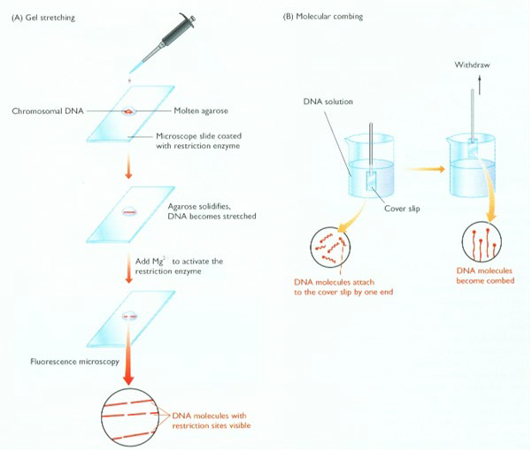 The DNA must be first attached to a glass slide in such a way that the individual molecules become stretched out, rather than clumped together in a mass. There are two ways of doing this