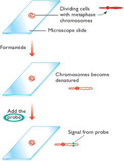 A sample of dividing cell is dried onto a microscope slide and treated with formalmide so that the chromosomes becomes denatured but do not loose their characteristic metaphase morphologies. The position at which probe hybridizes to the chromosomal DNA is visualized by detecting the fluorescent signal emitted by the labeled DNA.