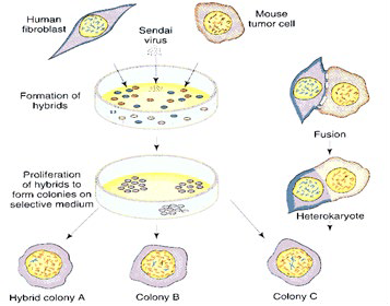 Under the influence of Sendai virus, human fibroblast cells and mouse tumor cells grown together in culture will fuse to form a heterokaryote, in which the nuclei fuse. Because the cell machinery is primarily murine, over successive mitotic divisions, human chromosomes (in blue) are gradually lost. Eventually, a number of hybrid cell lines are formed that have only one (Colony A) or a few (Colonies B & C) human chromosomes, which are readily identifiable. These cell lines can be screened for the presence of various human biochemical markers, which are then assignable to the retained chromosome.