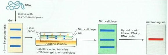 This method developed by a molecular biologist E.M Southern [17, 22] in 1975 for analyzing the related genes in a DNA restriction fragment is called as southern blotting technique. This blot can easily provide a physical map of restriction sites within a gene located normally on a chromosome and reveal the number of copies of gene in the genome, and of gene when compared with the other complimentary genes. Thus the sequences of DNA are recognized following the sequence of nucleic acid probe.
