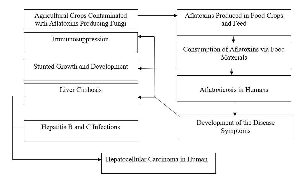 The disease caused by the ingestion of aflatoxins is collectively known as aflatoxicosis. Though the aflatoxins are usually excreted by the urine, liquid bile and through milk, they are quite toxic while inside the body. While the higher degree of aflatoxicosis results in death, their chronicity mainly developed immune suppression and cancer in humans. Aflatoxin B1 usually develops hepatocellular carcinoma in humans [33]. It is more easily developed in those already having hepatitis B infection in the past. The disease is further characterized by nausea and vomiting, stomach pain, oedema and aspergillosis in the lungs, convulsions, fatty liver, kidney failure, heart anomaly, cerebral oedema, coma and death [1,17,38] (Flowchart/Figure 2).
