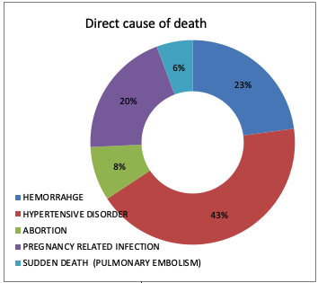 The classical triad of hemorrhage (23%), eclampsia (43%), and sepsis (20%) was the major direct causes of maternal deaths, whereas8.6% deaths are due to abortion and only two maternal deaths (5.7%) was due to pulmonary embolism (fig 1).