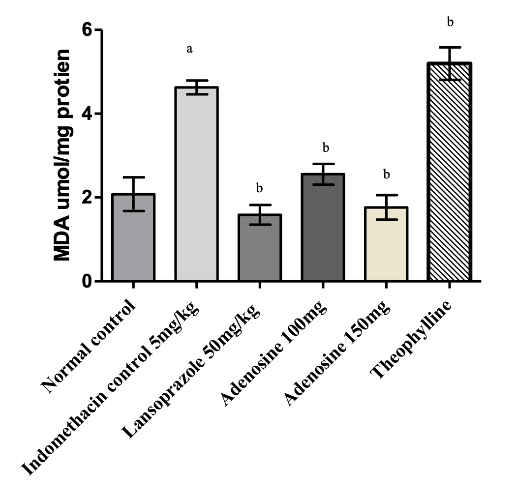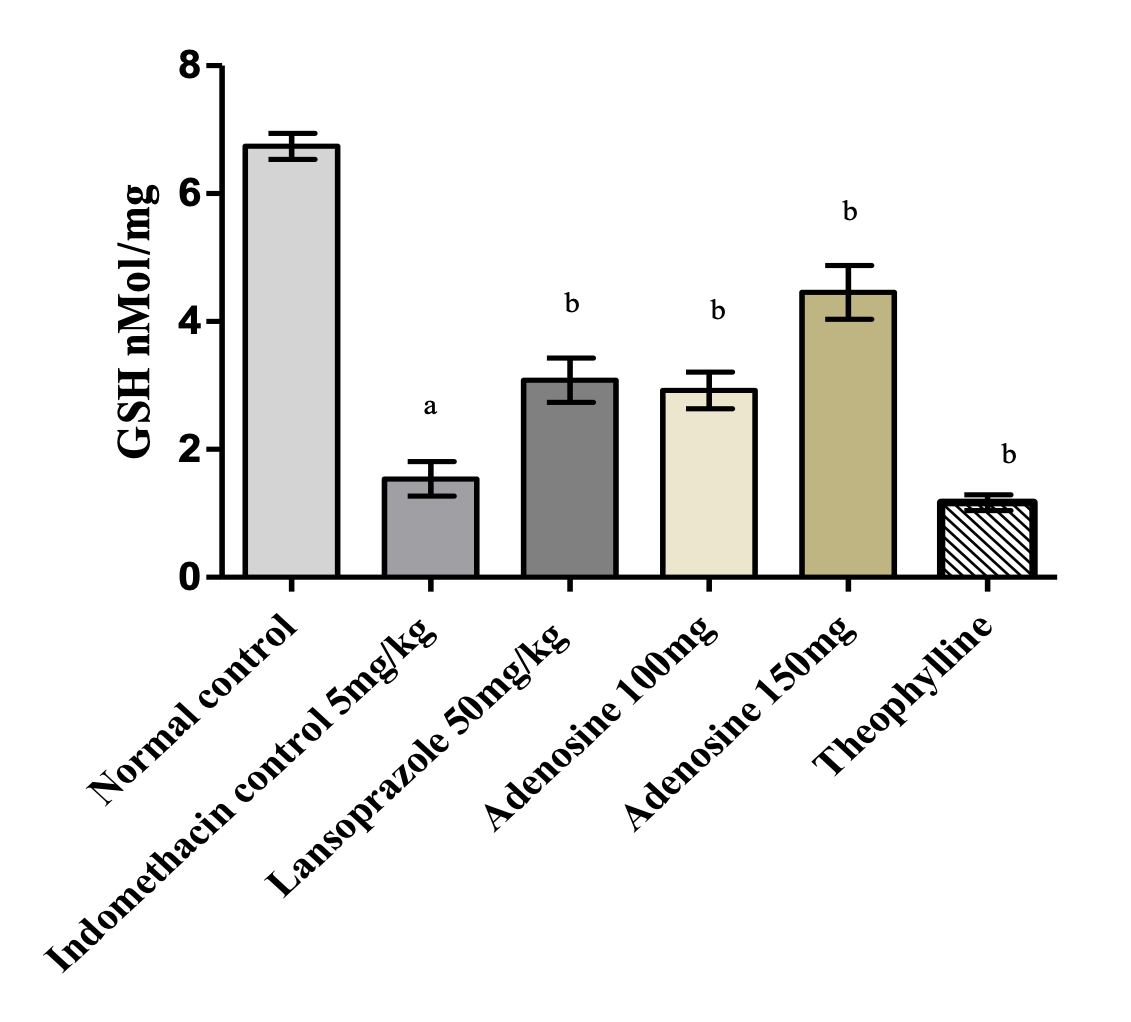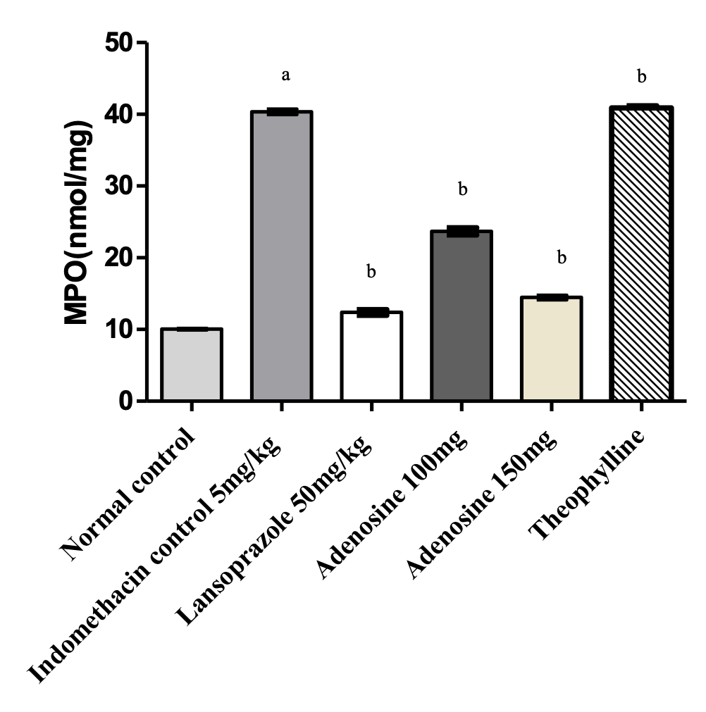 Indomethacin (Octane Biotech Pvt. Ltd. Lucknow), Adenosine (central drug house Pvt. Ltd), Theophylline ( central drug house Pvt. ltd), Lansoprazole (Casca Remedies Pvt. Ltd Kuldeep\ Nagar, Ambala), EDTA (Loba Chemie Pvt. Ltd Tarapur MIDC, Mumbai), Tris buffer (Finar chemicals Ltd. Ahmadabad), Acetic acid (Ozone International – Mumbai, India), DTNB (Chemika Reagents Ltd. Mumbai ), Trichloroacetic acid (Research lab fine chem. Industries- Mumbai, India). The kits for TBARS, GSH and MPO were obtained from Transasia bio- medicals Ltd. Baddi (HP). All drug solutions were freshly prepared before use [60-65].