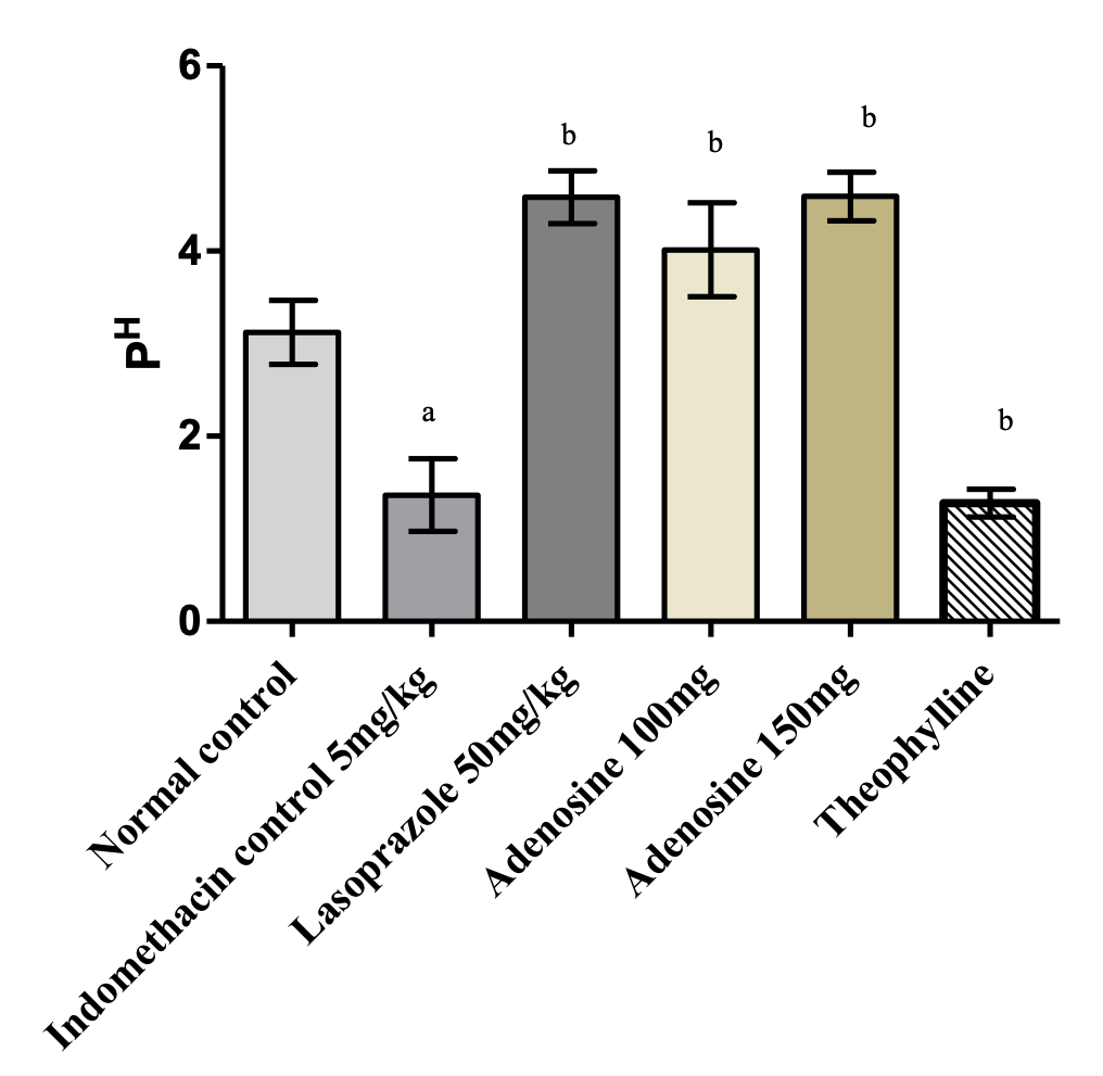 According to the latest WHO data published in May 2014, Peptic ulcer disease deaths in India reached 85,487 or 0.96 per cent of total deaths. The age-adjusted death rate is 9.12 per cent of 100,000 of the population, ranking India 26 in the world. Adenosine, adenosine 5′-triphosphate (ATP), ADP, AMP, uridine 5′-triphosphate (UTP), UDP, and UDP-glucose are endogenous purines that activate P1, P2X, or P2Y purinoceptor families that are widely and differentially distributed in the ENS and non-neuronal cells in the git [15-20]. The tissue distribution and/or biological experiments suggest that up to 14 of 18 purinoceptors may be involved in secretomotor reflexes in the GI tract. The term Purinergic receptors were first introduced to describe classes of membrane receptors that, when activated by either neurally released ATP (P2 purinoceptor) or its breakdown product adenosine (P1 purinoceptor), mediated relaxation of gut smooth muscle [20-25]. P1 purinoceptor or adenosine (ADO) receptors mediate the biological effects of the endogenous nucleoside adenosine and its analogs. Adenosine acts on cell surface receptors that are coupled to intracellular signalling cascades and are mainly divided into 4 subtypes: A1, A2A, A2B, and A3 and all of these ADO receptor subtypes are G-protein coupled receptors (GPCRs). Adenosine is an important endogenous regulator of many physiological processes, including blood flow, seizure activity, airway resistance and neuronal activity. There is now increasing direct and indirect evidence that adenosine and its receptors are involved in the control of gastric acidity and modulation of gastric responses to histamine and acetylcholine [25-30]. Purinergic signalling occurs quickly during synaptic neurotransmission, a neuromuscular transmission that causes smooth muscle to contract or relaxes, and exocrine or endocrine secretion. However, the regulation of long-term events, including cell proliferation, differentiation, migration, and death by purinergic signalling, is now well documented in the contexts of development, regeneration, and wound healing [30-40]. P2X and P2Y receptors play prominent roles directly and by modulation of other signalling systems in embryonic development, including the nervous system, cartilage in limb buds, the mesonephros, retina, myotubes, and neuromuscular junctions. Adenosine inhibits gastric acid secretion, either directly by acting on acid-secreting parietal cells or indirectly by stimulating the release of the acid inhibitor, somatostatin [40-45]. Adenosine promotes tissue protection and repairs through four general modes of action: increased oxygen supply/demand ratio, preconditioning, anti-inflammatory effects and stimulation of angiogenesis. Thus, adenosine downregulation of inflammatory and immune responses in injured tissues plays a crucial role in the beneficial effects induced by this nucleoside [45-50]. Theophylline has been widely used in the treatment of airway diseases, although the mechanism of action of this drug remains unknown. Theophylline has well-documented effects on smooth muscle, possibly related to its ability to act as a non-selective phosphodiesterase (PDE) inhibitor. However, recent clinical observations have suggested that theophylline can also have significant effects on circulating inflammatory cells at plasma levels well below those required to affect airway smooth muscle. Thus the present study was designed to investigate the effect of Adenosine on purinergic receptors in the treatment of gastric ulcers [50-55].